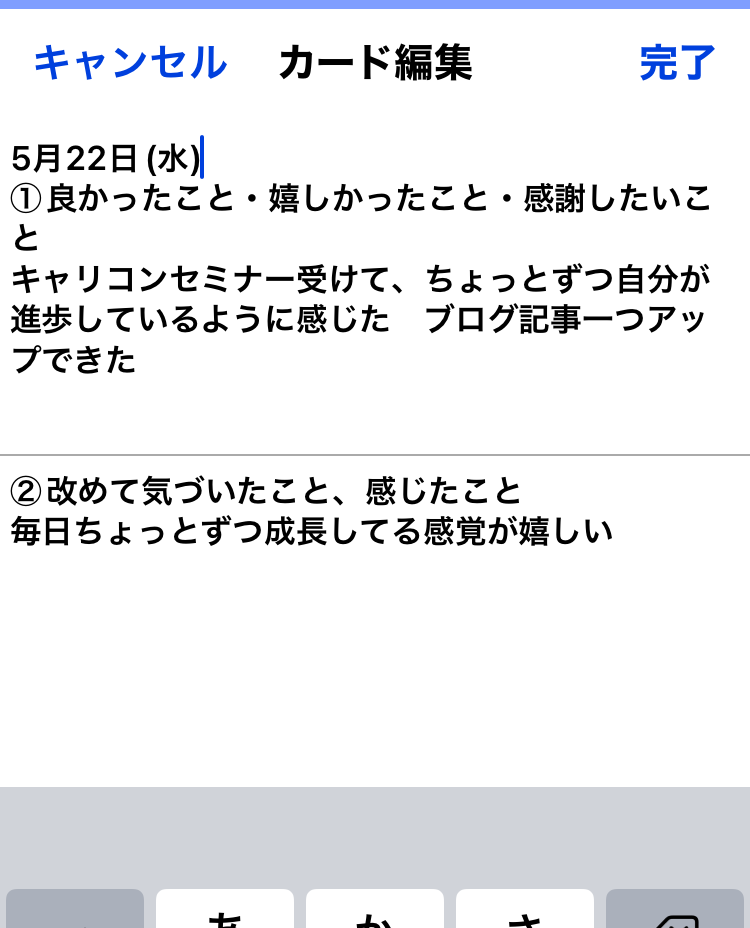 次に、「①良かったこと、嬉しかったこと、感謝したいこと」と記入します。これはスマートフォンの単語登録機能を活用します。